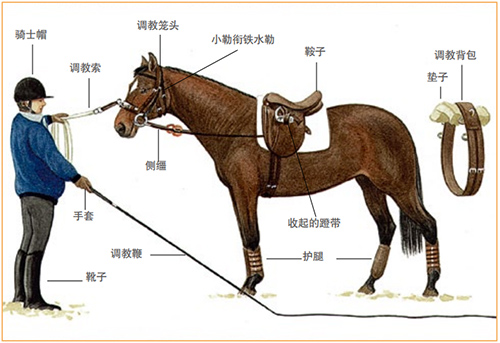 调教索一定是做成管状的带子或结实的皮革,环扣一头系在调教笼头或衔铁上。不可使用尼龙调教索,因为容易滑,并灼伤手,即使佩带着手套。