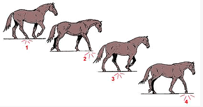 慢步(walk)又叫常步,是马行走的基本方式,是四节拍(蹄音)步伐,踏蹄的顺序为:右后——右前——左后——左前。速度为3-4英里/小时。