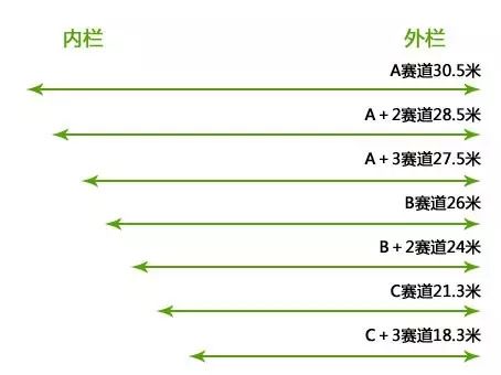 香港的跑马地马场的赛道共分为A、A+2、B、B+2、B+3、C、C+3,A赛道最宽,C+3最窄。如下图所示: