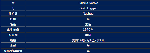 “淘金者”(Mr.Prospector)之父Raise a Native是成功种马,其母Gold Digger出自马王Nashua,此优秀的血统令其于周岁时在昆士兰7月周岁马拍卖会中以全场最高价(220,000美元)出售。
