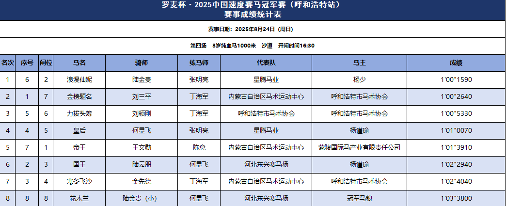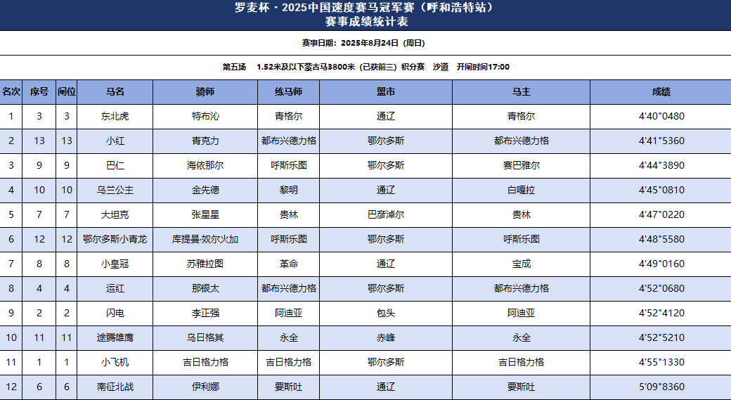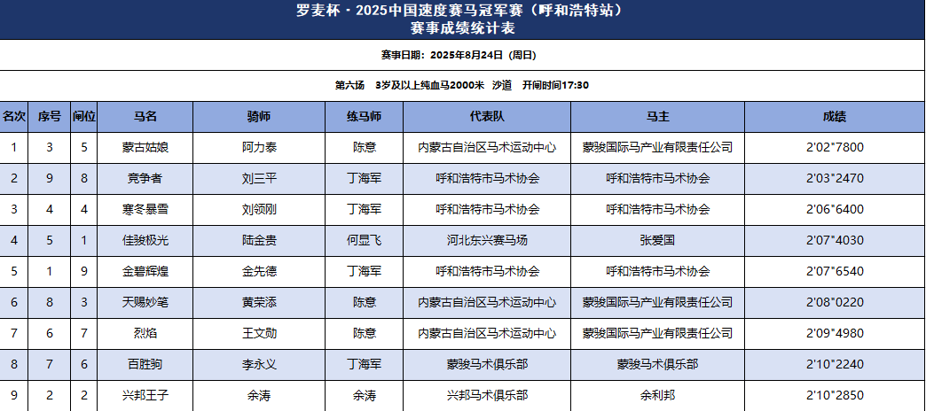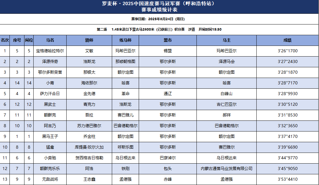 2025年8月24日,罗麦杯·2025中国速度赛马冠军赛(呼和浩特站)在内蒙古呼和浩特市少数民族群众文化体育运动中心顺利举办。各参赛马匹成绩如下: