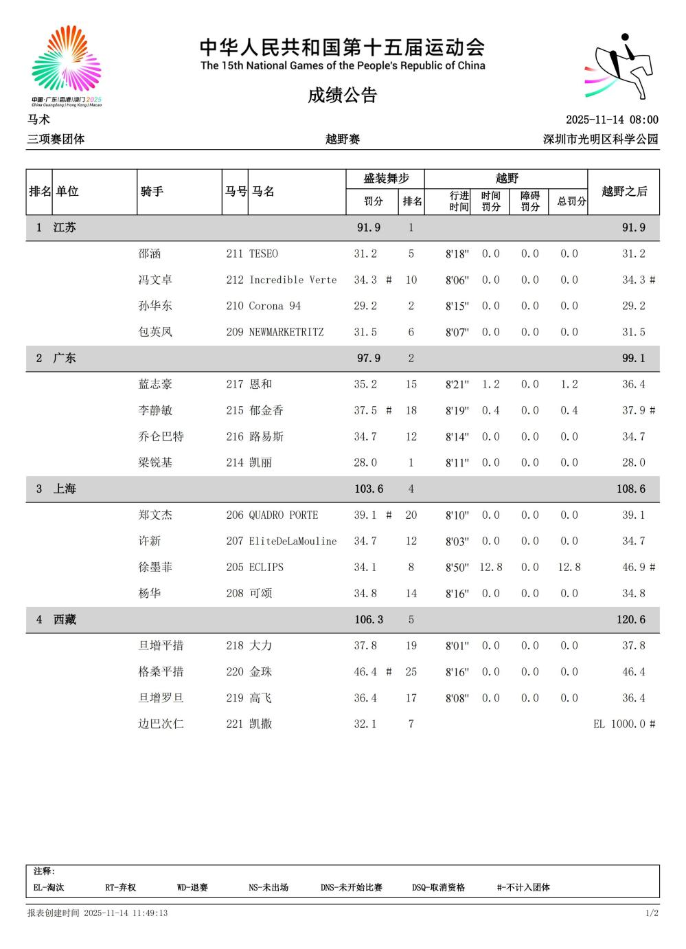中华人民共和国第十五届运动会马术三项赛团体赛决赛(个人资格赛)的第二项越野赛,于11月14日在深圳市光明区科学公园举行。6支队伍,25对人马组合参与激烈争夺,人马平安完赛。