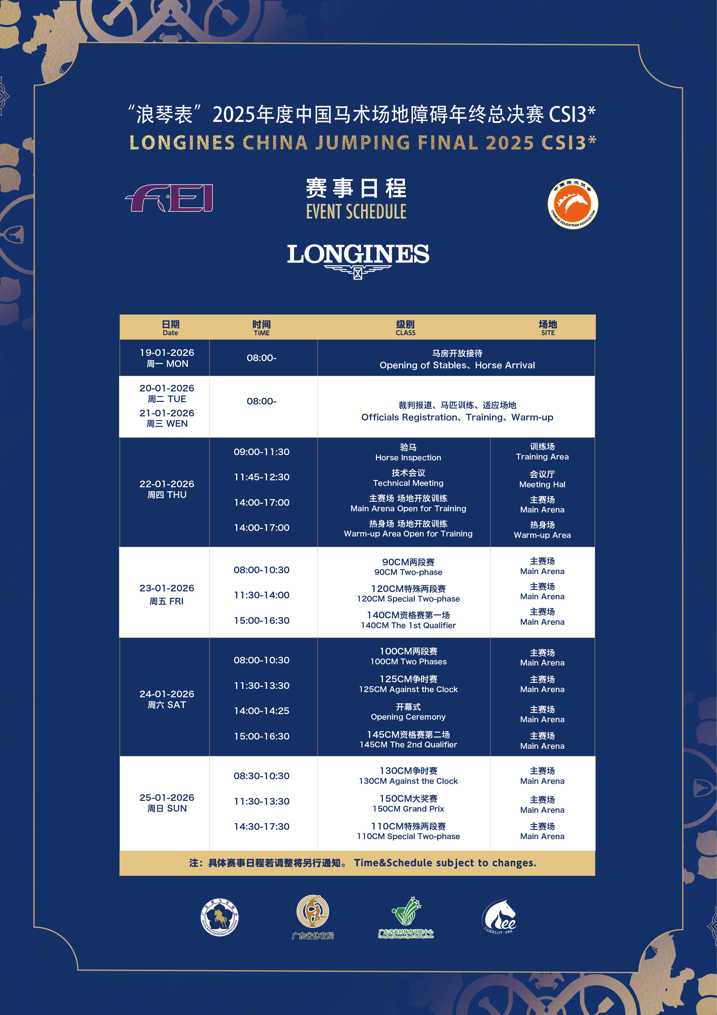 “浪琴表”2025年度中国马术场地障碍年终总决赛CSI3*将于2026年1月22日(周四)至1月25日(周日)在广东省黄村体育训练中心举办。为使比赛顺利进行,现将赛事有关事宜通知如下: