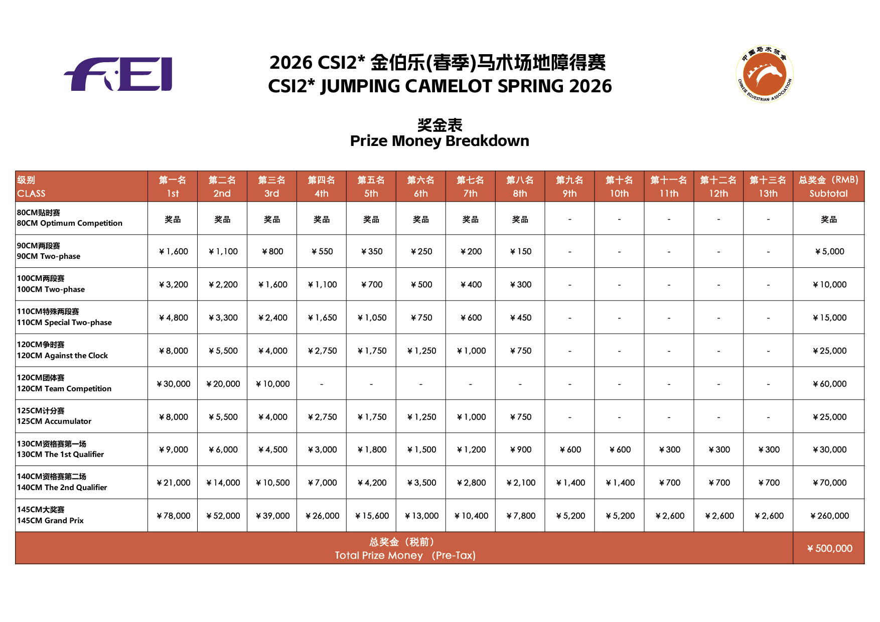 3.所有参赛运动员应完成中国马术协会(CEA)2026年度注册手续;FEI级别(1.30米-1.45米级别)骑手须完成国际马术联合会(FEI)2026年度注册手续获得FEI ID。