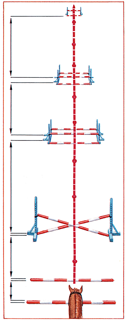 如果间隔距离不适合你的马,你必须作适当的调整。步幅大的马跳最后一个栏可能要尽力缩短步幅跳越,在这种情况下向前移动垂直栏加大距离,马就容易跳越了。
