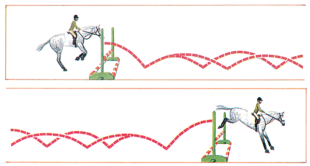 马或矮马都必须随时变换步态,确保不丧失节奏。任何时候丧失节奏都表明缺乏推进力和平衡。在平地所做的一切训练都应有助于马匹能伸长或缩短它的步幅,同时又不丧失节奏或平衡。这种两个障碍的平地跳越就证明了这一点,并且应从两个方向跳越。