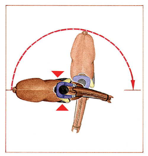 外方缰控制不让马匹向前,但允许有轻微的屈挠。内方腿在肚带后要求后躯移动。外方腿再向后,必要时控制马的后肢甩出。