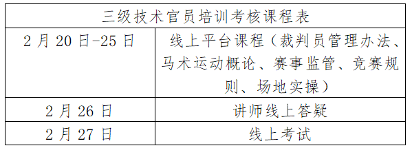 根据马术专业人才培养计划,我协会将与江苏省马术协会于2022年2月20日-27日在线上举办马术场地障碍项目三级技术官员培训考核活动,合格者授予中国马术协会相应等级技术官员证。现就本次培训考核相关事宜通知如下: