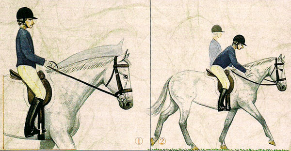 要让你的手随着马匹头部的前后运动而前后运动,这样马的脖子可以伸长并流畅运动,而不是紧张、抗拒。用这种很轻的接触,你会感觉到马的嘴部是很柔软的。过一段时间后,如果你不去跟马匹较劲,它将把口衔向前要,这是马匹工作受衔的第一阶段,也是让马匹身体正直的先决条件。