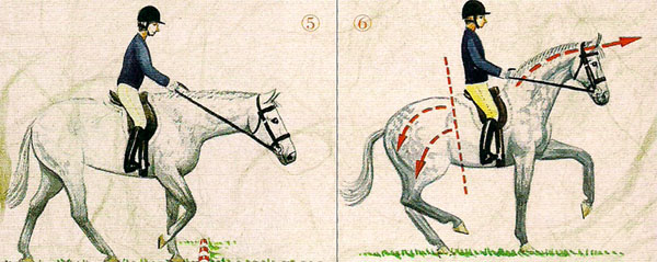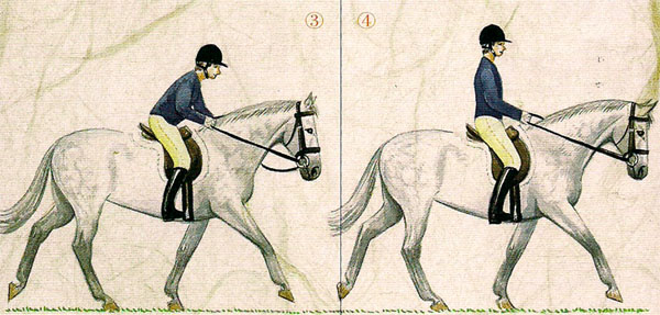 如果马匹伸长脖子下部的肌肉,从你手中要更多的缰,不用担心(图⑤)。要让马匹的整个脊椎充分伸展开,才能最终使马匹达到收缩。只有使马匹的整个躯体更伸展,它的躯体才更有力量,才能做更多的高级动作(图⑥)。