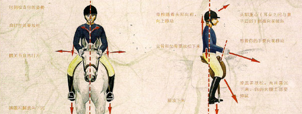 要不停地检查自己的姿势感觉你的脖子是否自由,你的肩膀是否放松,你的胳膊肘是否放松并且下垂,你的肘部不要靠在肋骨上锁定住,要让它稍微向外一点。想象你的双手手腕内侧有光束照耀着彼此,这会帮你保持手部握缰姿势的端正:手掌是放松的,指尖接触手掌心。