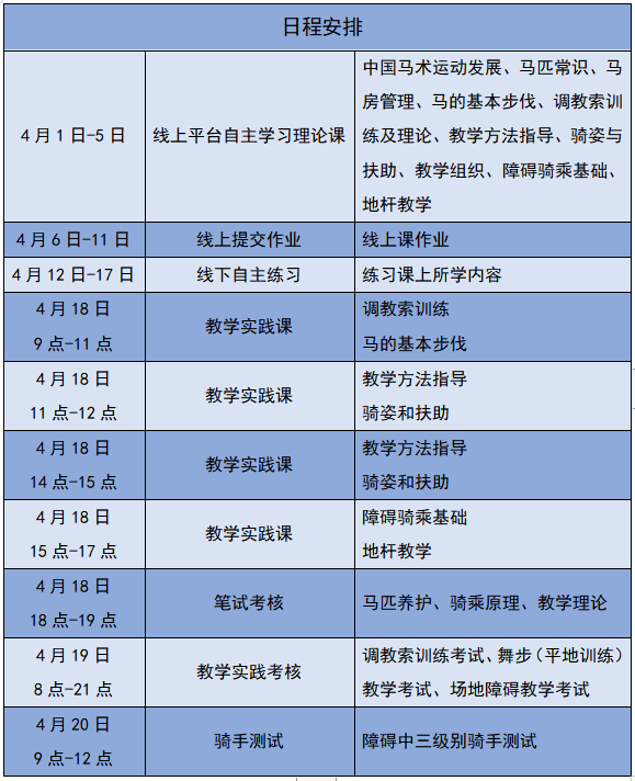(三)线下辅导和实践考核:2022年4月18日-20日,在北京骑缘国际马术俱乐部进行线下集中辅导与实践考核。
