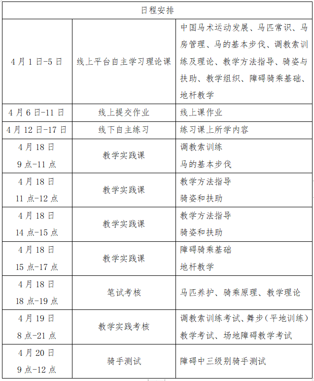 线下辅导和实践考核:2022年4月18日-20日,在北京骑缘国际马术俱乐部进行线下集中辅导与实践考核。