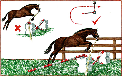 一旦消除了所有可能的原因,你就会总结出该马并不是害怕,而只是有点淘气。在这种情况下,你就需要很坚决地对待它,一犹豫,就用调教索要求它。总是确保马在完成最好的时候结束,即使这意味着要降低障碍的高度,以便马匹能再次自由跳越。