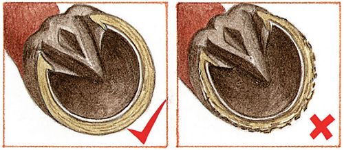 蹄铁的合适程度要看它是否对马的蹄踵提供一个大的支撑面。马蹄应该处于最佳状态。如果由于蹄角质弱或松软易损,蹄铁装钉不牢固,那么在期望马应对耐力骑乘的额外训练前,要注意在饲料中添加利于马蹄角质生长的添加剂。