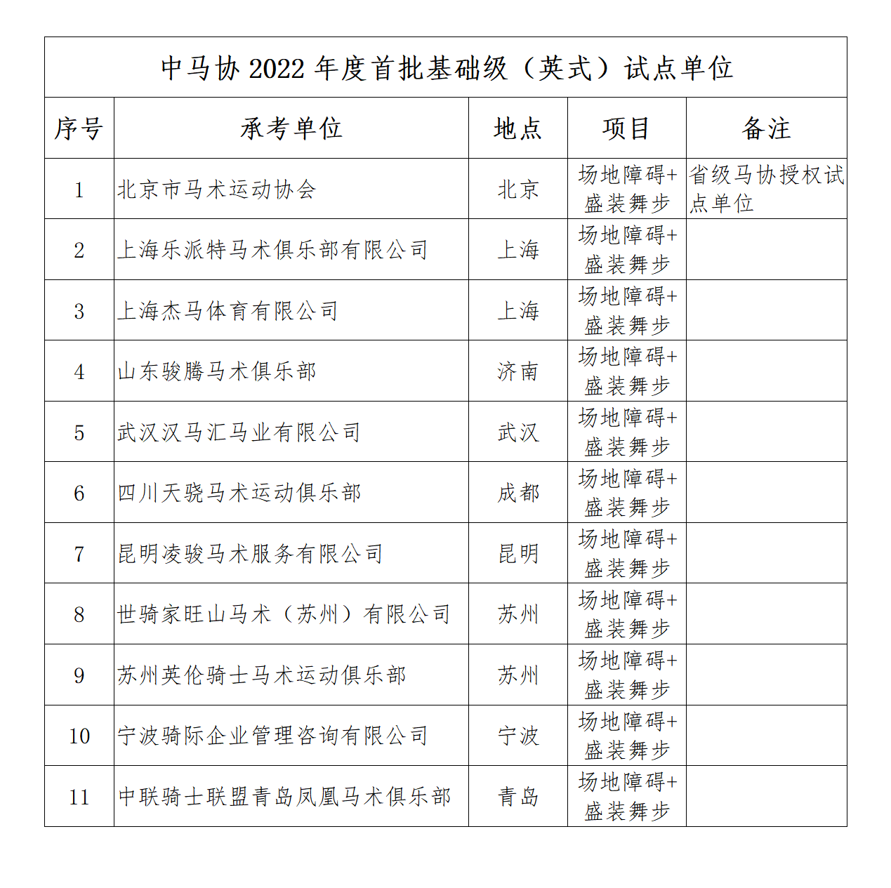 我协会于2021年8月31日发布了《中马协关于公开招选基础级考核试点单位的通知》,共收到20余家申请单位提交的申请材料。我协会对所有材料进行了统一核查,依据通知要求,经研究确定了2022年首批基础级(英式)试点单位。现就2022年中马协骑手分级考核首批基础级(英式)试点单位公示如下:
