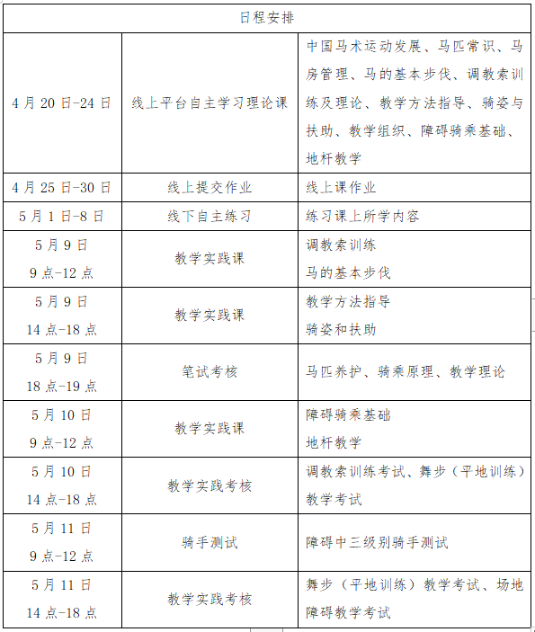 线下辅导和实践考核:2022年5月9日-11日,在无锡阳山梦想马术学府进行线下集中辅导与实践考核。
