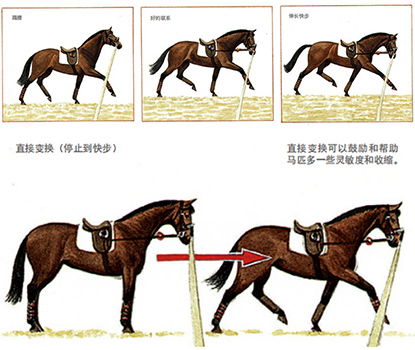 这里最普遍的问题是马匹也许会变得过度兴奋。如这种情况发生,就要使马匹再做快步并要等待马匹安静下来后,再重试。你能通过在圈线上开展这项工作来要求步伐伸长。