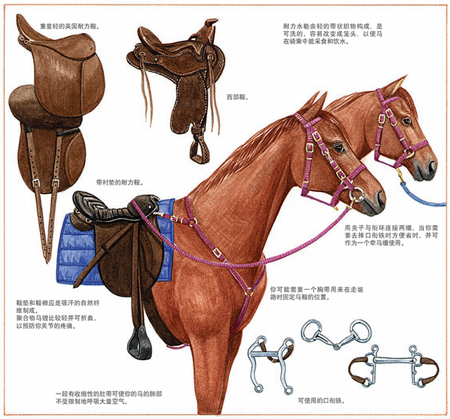 随时对照骑马规则检查,确保你的马具符合规则要求。如果开始频繁参加竞赛,那你可能希望购买一些专门的马具。在耐力骑乘中,重点是放在舒适、重量轻和耐用上。有许多专门的马鞍可用,都设计成能将骑手的重量分散在马背的更多地方,使马更舒适,同时能使你骑在最佳位置上。