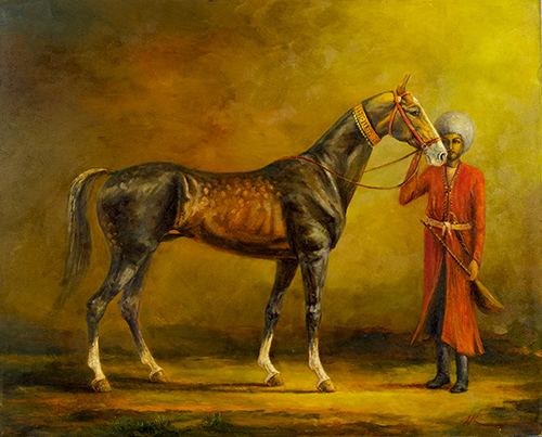 伊杉古力是土库曼斯坦当代以画马著名的油画家,其画马作品多以阿哈尔捷金马为题材,构思巧妙,造形准确,色调浑厚,作品无不体现画家对马细致入微的观察和浓浓的感情。