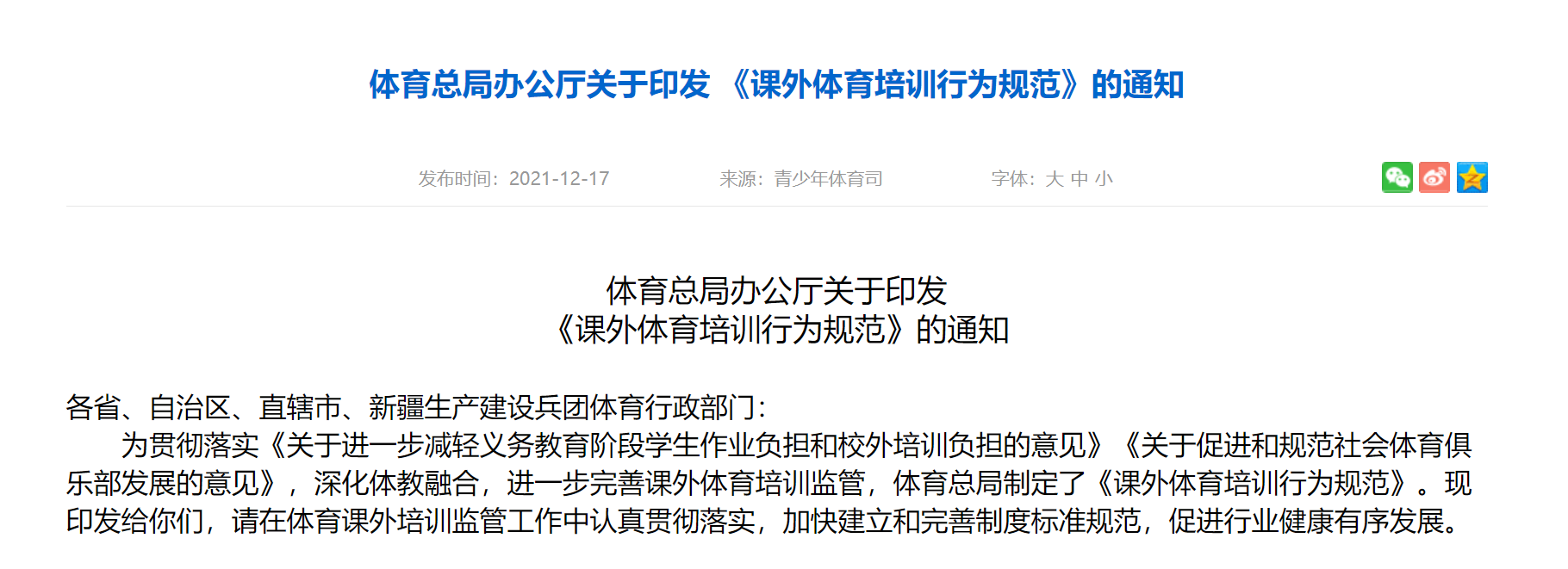 为贯彻落实《关于进一步减轻义务教育阶段学生作业负担和校外培训负担的意见》《关于促进和规范社会体育俱乐部发展的意见》等文件要求,深化体教融合,进一步完善课外体育培训治理,体育总局办公厅印发《课外体育培训行为规范》。