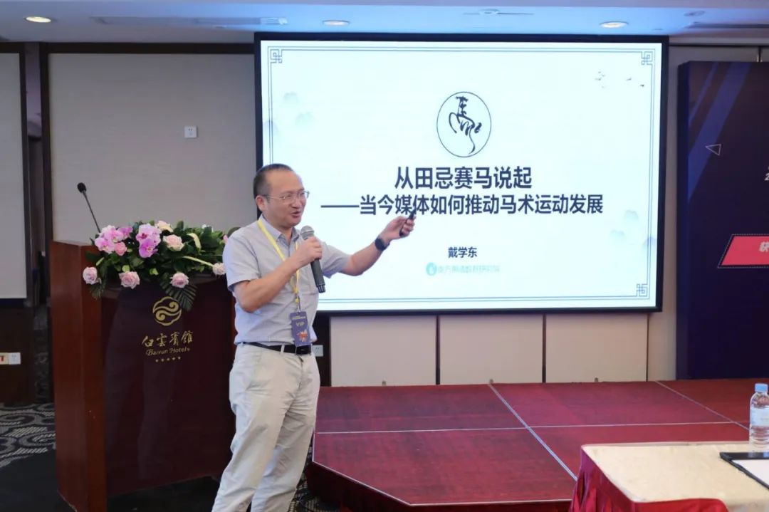 南方报业传媒集团新媒体有限公司总经理、中山大学传播与设计学院兼职教授及硕士导师戴学东在随后展开了《从田忌赛马说起——当今媒体如何推动马术运动发展》的课题讲述。戴学东以田忌赛马的故事为引,向大家讲解了古今媒体如何报道赛马赛事,以及广州地区的赛马运动发展情况,他表示,马运动产业需要媒体引人入胜,树立形象,最终目的是要打造让人印象深刻的品牌。