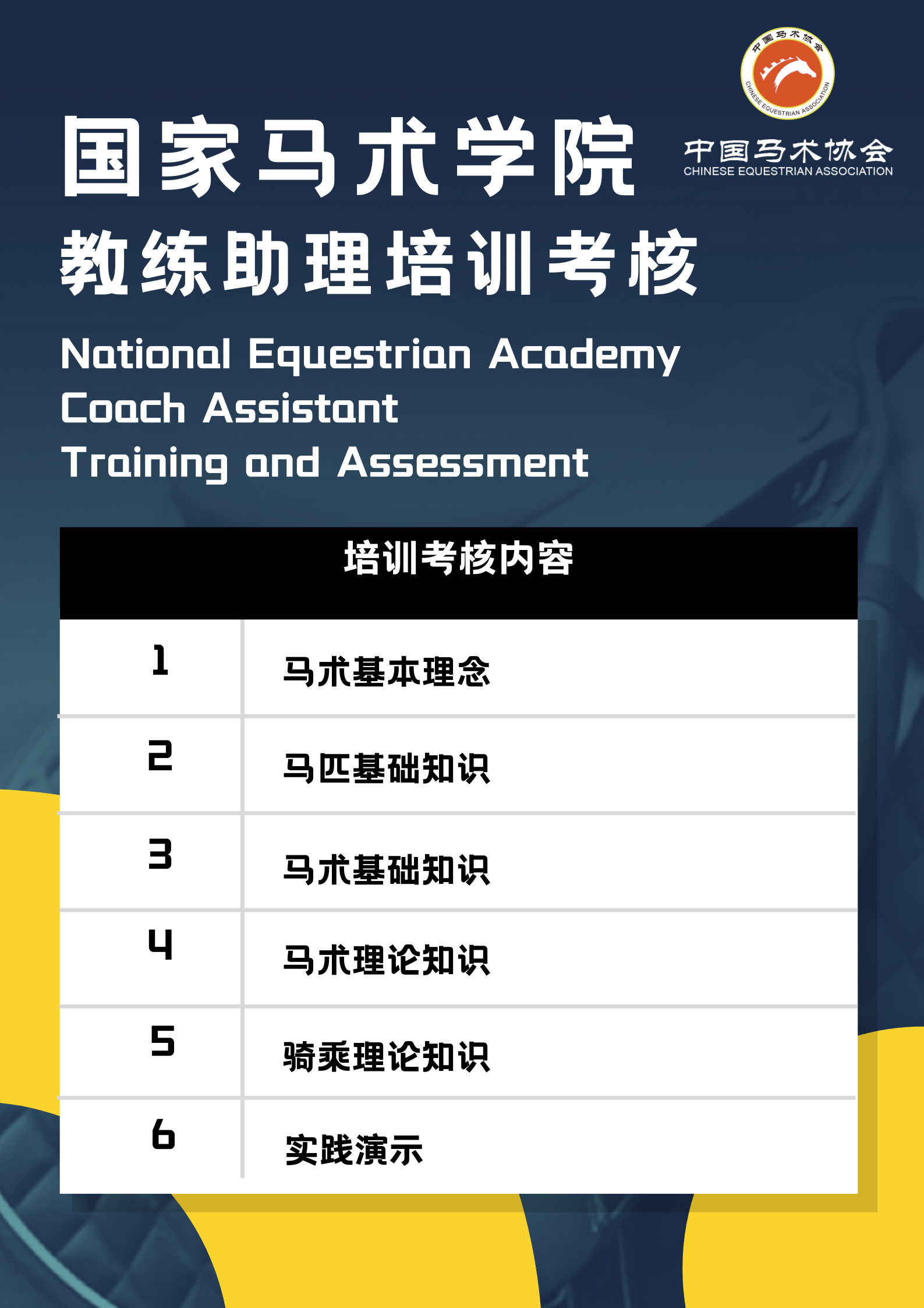 为了贯彻落实习近平总书记对体育工作系列重要讲话和指导精神,深化“体教融合”工作,进一步夯实马术运动发展的人才基础。中国马术协会与武汉商学院合作共建中国马术协会国家马术学院于2021年12月开班,在教练员、技术官员、马匹护理师等方面开展专业人才培养,为行业输送新鲜血液。2022年6月19日至20日,国家马术学院开办马匹护理师、教练助理培训考核课程,共计60名学员参与。