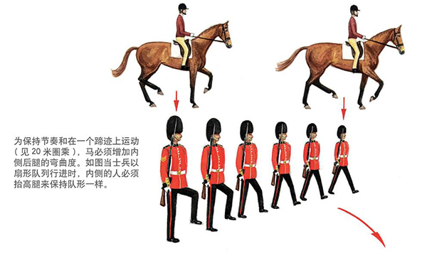 为保持节奏并在一个蹄迹上(见20米圈乘),马必须增加内侧后腿的弯曲度。同样当士兵以扇形队列行进时,内侧的人必须抬高腿来保持队形。