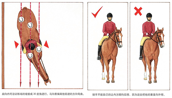肩向内沿训练场的边墙呈30度角进行,使马向着偏离它的移动方向弯曲。