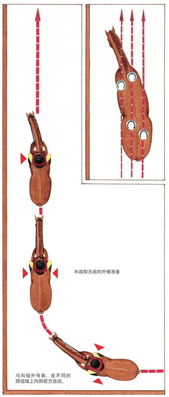 肩向外这个词不是很恰当,因为在所有侧行运动中,马要弯曲的那一侧是内方。但是,由于肩部移向训练场外侧,所以用肩向外来描述这个动作。