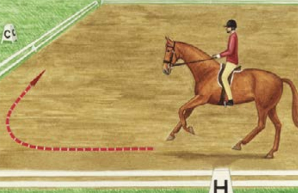 走出拐角,在骑手给予辅助转为中间快步或缩短跑步前,马体必须是伸直。如果马在快步走时仍旧弯曲着,它有可能会变成缩短跑步,不仅因为它是不平衡的,而且因为它认为得到了缩短跑步的辅助。如果它在缩短跑步时弯曲,中等的步伐会受限制,整个动作是畸形的。