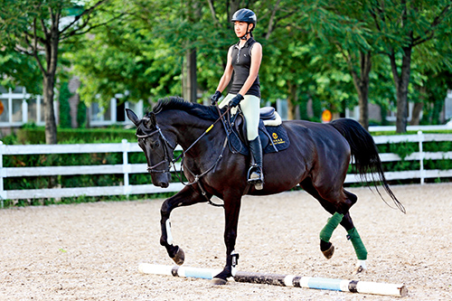 记住,理想的姿势是耳朵、肩膀、臀部以及脚跟在一条完美的垂直线上。强迫脚跟向下会导致大部分重量落在前脚掌,同时,垂直线也会扭曲。让体重落在后脚跟上,身体放松,让腿更舒适、有效、安全地靠在马身上。