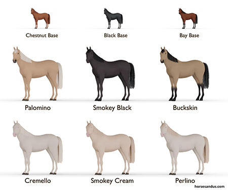 修饰基因多种多样,有控制毛囊内真黑素和棕黑素相对数量的Agouti;有控制青色的Gray基因;控制被毛上白色斑点的Tobiano,等等等等。这些修饰基因自由组合,独立或共同发挥作用,形成了黑红色基础下,马的淡化毛色。鹿皮色马,其实就是骝色马的被毛淡化;帕洛米诺,是栗色马的被毛淡化。