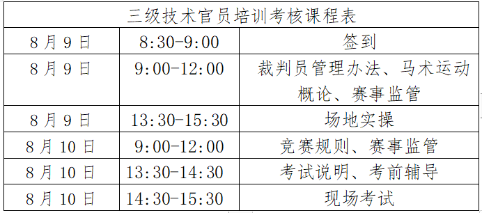 根据马术专业人才培养计划,我协会与湖南省马术运动协会将于2022年8月9日-10日在骑乐马术·长沙尚马汇俱乐部举办三级技术官员培训考核活动,合格者授予中国马术协会相应等级技术官员证。现就本次培训考核相关事宜通知如下:
