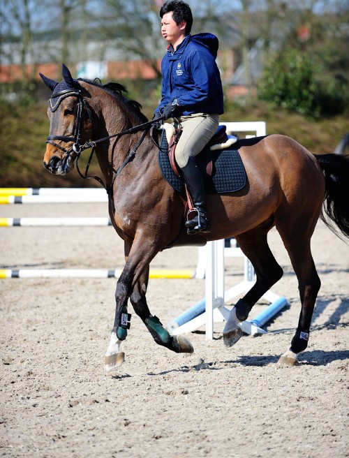 在三根地杆之间随机圈乘跑步。从大圈转弯开始,进入线路后可在跨越地杆中变换领先腿或直行通过地杆后再变换领先腿。很显然在障碍间,骑手不可能总是在跨越中换腿。这个训练就是希望骑手能够去想:我要向右,转换,然后向左。骑手必须时刻思考和反馈,并且随时准备切换到B计划,因为无法百分之百地保证每次都能在跨越中完成空中换腿。