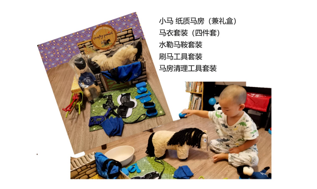 在妈妈的帮助下,通过Crafty Ponies玩偶马术产品,他学会了不少马术知识。他会牵马了,会穿脱护腿,打护腿,对马术的兴趣越来越浓。他的改变令身边的人感到十分惊讶,一个2岁多的孩子能在短时间内能学到这么多的知识,而且这些知识非常专业。