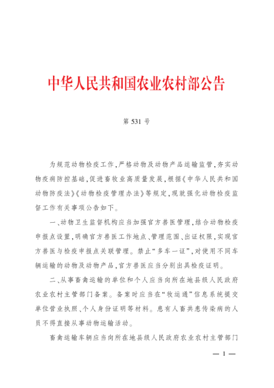 解读农业农村部“强化动物检疫监督工作”公告(第531号)