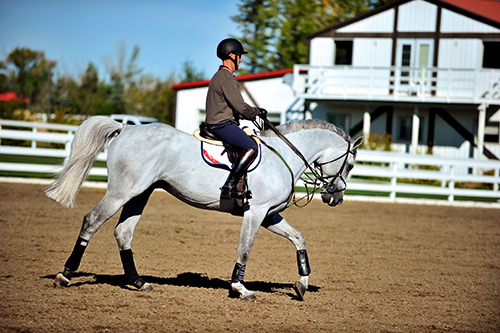 在各种停止和半减却,以及各种变换中,增加两侧坐骨的重量可提高马的后肢动力。结合驱动性的腿部辅助,这种重量辅助会刺激马的双后肢向前朝着重心的方向更深地踏出,蹬踏地面更加有力。