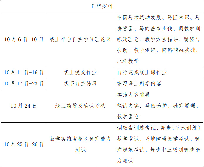 马术一星级专业教练培训考核将于2022年10月6日-26日在线上开班。本次活动以线上方式进行培训与考核,中外专家联合授课。考核合格者将被授予中国马术一星级专业教练员能力水平证书,并可进一步申报全国初级教练员岗位班,经考试合格后获取初级职称。