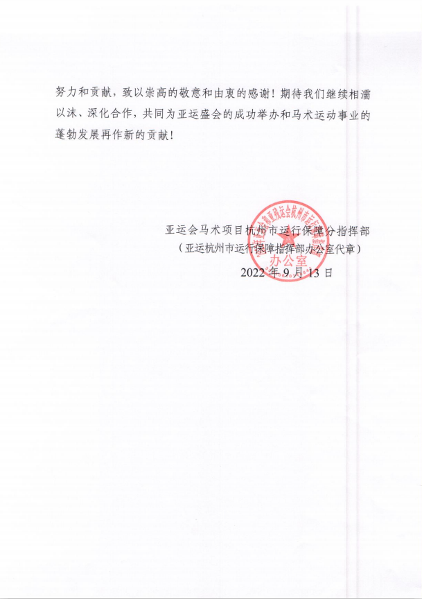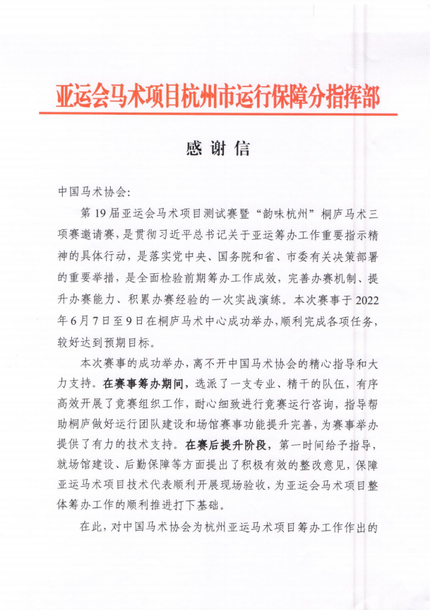 亚运会马术项目杭州市运行保障分指挥部致中国马术协会感谢信