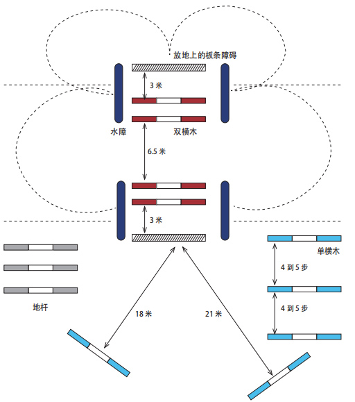 “我的场地里一直摆着我训练马房里所有64匹马的路线;四岁到十五岁的马都会一周用一次。在长边上,我摆快步或跑步过的几根地杆。在另一个长边上,我摆固定距离(3、4到5步)的可以双方向过的迷你障碍或小单横木在一条直线上。中间那条线由一个跳蚤障碍(3米)、加上一个教马要学会尊重的板条障碍(Plank)摆在地上,再加上一个很低但是有时比较宽的双横木,之后还剩一步距离,完成后同一个路线反方向再来,也就是说先跳双横木再跳板条障碍。在障碍的两侧,摆窄的水障,以便教马即便有水的存在仍然能够集中注意力,因为水经常会导致马分散注意力,甚至拒跳。如果他们在家老看到水障,就不会再在意了。我也摆两个单横木,离入口的距离分别为18和21米。马必须习惯各种顺序过各种各样的小障碍而不心存疑虑。我从来不跳高障碍。我追求训练的多样化,以便让马又专心,心情又好。如果马年轻,我就花更长一点的时间。关键是马要能够完美地完成简单的事情。之后在室内比赛中,在技术含量高的路线上,一切都将取决于他的调教程度。他将能够收放自如,应付急的回转,且保持聆听状态。”