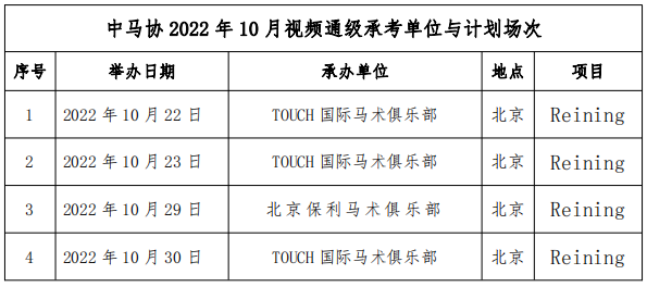 为进一步推进Reining项目通级考核工作,现将2022年10月Reining项目视频通级承考单位及场次公布如下: