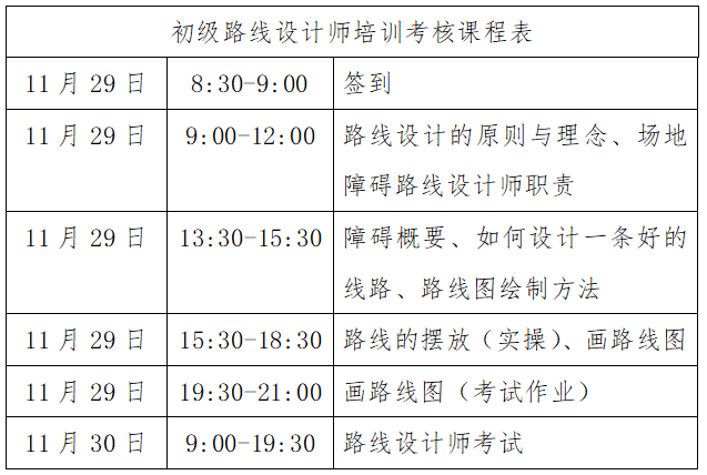 为了满足日益增长的人才需求,我协会将于2022年11月29日-30日在广州泰骏国际马术俱乐部举办初级路线设计师培训考核活动,合格者授予中国马术协会相应等级证书。现就本次培训考核相关事宜通知如下: