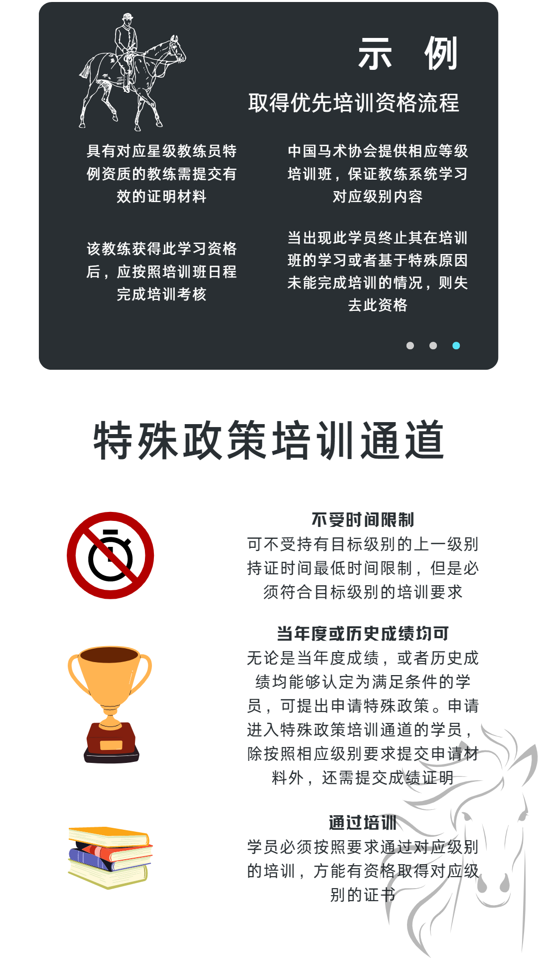 马术运动的发展离不开优秀的教练员、运动员做出的贡献和投入。为了鼓励中国马术运动的传承者,中国马术协会对优秀的教练员、运动员申请教练员技术等级开辟政策通道,本次对有对应历史比赛成绩和教学经验的教练员、运动员进行定向培训定星。