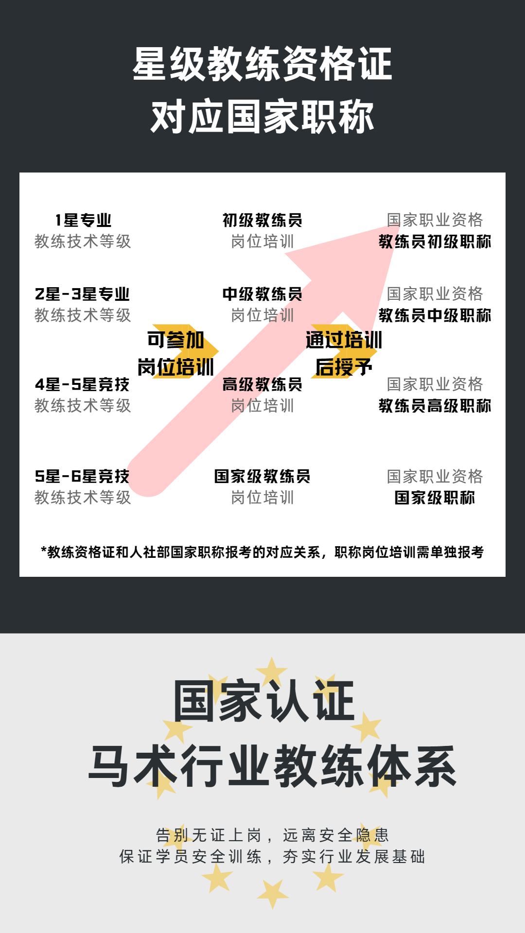 中国马术协会星级教练员体系还对应国家体育总局的教练职称评定,对于在机关单位工作的教练员、运动员的岗位晋升也有帮助,能够满足不同需求的学员的要求。