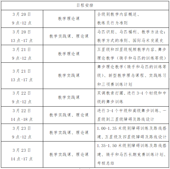 为了提升马术运动教学和训练水平,根据中国马术协会教练员培训计划,马术高级教练培训将于2023年3月20日-23日在线下举办。本次培训将由经验丰富的外教来华授课,进一步提升执教理论及实践水平。培训合格者将对应报名条件被授予中国马术协会星级教练员能力水平证书。