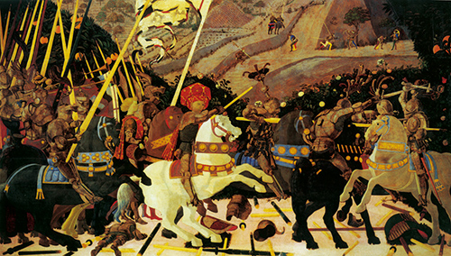 保罗·乌切洛是15世纪意大利最具魅力的画家之一,他一生致力于透视画法的研究,《圣罗马诺之战》是他晚年为了纪念1432年佛罗伦萨战胜锡耶纳之战而创作的杰出作品。该绘画可能是科西莫·迪·美第奇为了装饰美第奇宫殿而向画家订购的,我们看到这幅是三幅描绘同样战斗场面绘画中的一幅。画面中央骑白色战马的是佛罗伦萨军队的司令官,是科西莫的朋友、支持者尼克罗·达·特伦提诺。