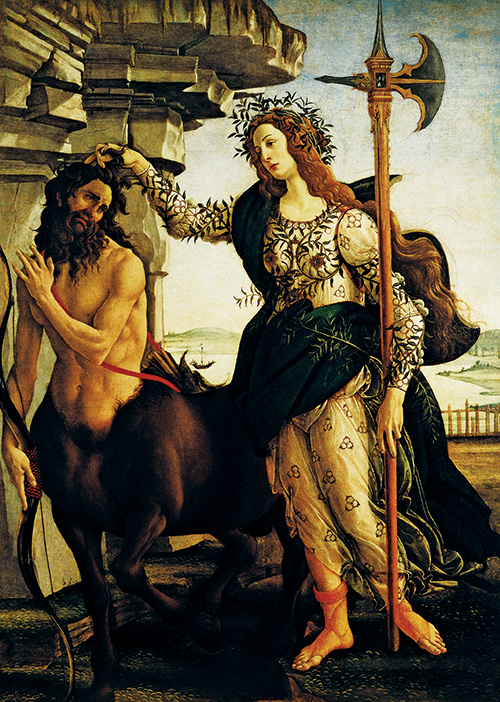 这幅作品深得波提切利自己的喜爱。他描绘了马人与女神米诺娃(即雅典娜)在一起的形象,从画中的马人身上看不到一丝贪婪之气。反之,这个半人半兽显得十分温柔、驯服,寓意智慧(米诺娃的象征意义)战胜了野蛮。