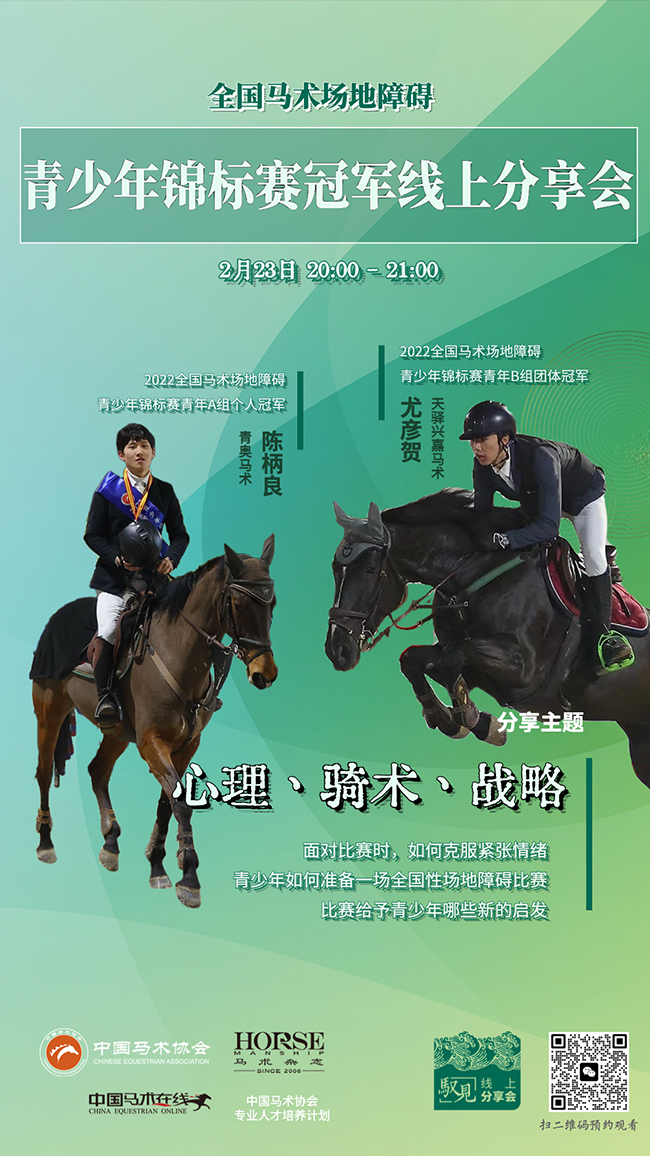 驭见·2022年全国马术场地障碍青少年锦标赛冠军线上分享会旨在分享青少年参与马术比赛的经验教训,分享马术训练日常和训练技巧,与青少年骑手和骑手家长共同探讨那些骑手们的成长故事。