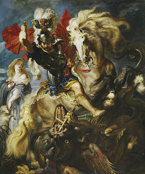 彼得·保罗·鲁本斯,一位在巴洛克美术中极具浓墨淡彩的佛兰德斯画家。他在年轻时,就已是一名虔诚的天主教徒,而反映到其作品上,我们可以看出宗教题材是其创作之主体。这幅《圣乔治斗恶龙》亦是如此,题材源于《圣经》,是欧洲古壁画及油画常用的题材之一。圣乔治,原为天主教的一名战士,因其屠龙的故事而被大为赞许,他身披铠甲,乘着白马,持着手中的阿斯卡隆枪,猎杀毒龙于地面,救下公主。而后,他也因之被尊为圣人,甚至成为英格兰的守护神。